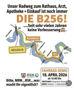 RADWEGE ….. weder früher noch heute Erinnerung: Leider weiterhin verkehrspolitischer Dornröschenschlaf in/für Windeck. Planungen und Umsetzungen an der B256+L333 ruhen weiterhin?Deshalb ruft der ADFC Obere Sieg zur DEMO auf. 18.04.‘26 10:00 Uhr Bürgerbüro, Rosbach-Dattenfeld und zurück. Mit Eurer Beteiligung, laut…