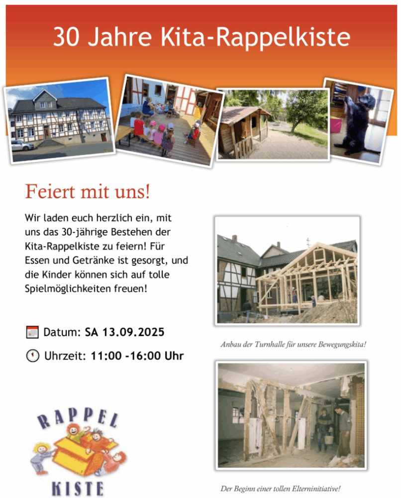 Wir laden euch herzlich ein, mit uns das 30-jährige Bestehen der Kita-Rappelkiste zu feiern! Für