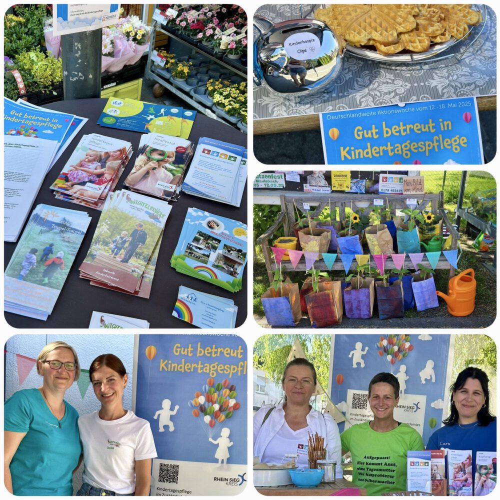 Ansässig der Aktionswoche waren am 11.05.2025 die Tagesmütter Isabelle Stöber, Annika Plänker und Caroline Ehrler auf dem Bauernmarkt in Leuscheid mit einem Aktionsstand. Dort wurden verschiedenen Angebote für Kleinkinder angeboten. Als weitere Aktion waren am 13.05.2025 am Nachmittag die Tagesmütter Stephanie Holschbach und Janina Böhme mit einem Waffel- Infostand am Rewe Dattenfeld. Die Einnahme in Höhe von 250 Euro vom Waffelverkauf wurden an das „Kinder und Jugendhospiz Olpe“ gespendet. Es waren zwei schöne Aktionstage mit netten Begegnungen und freundlichem Austausch.