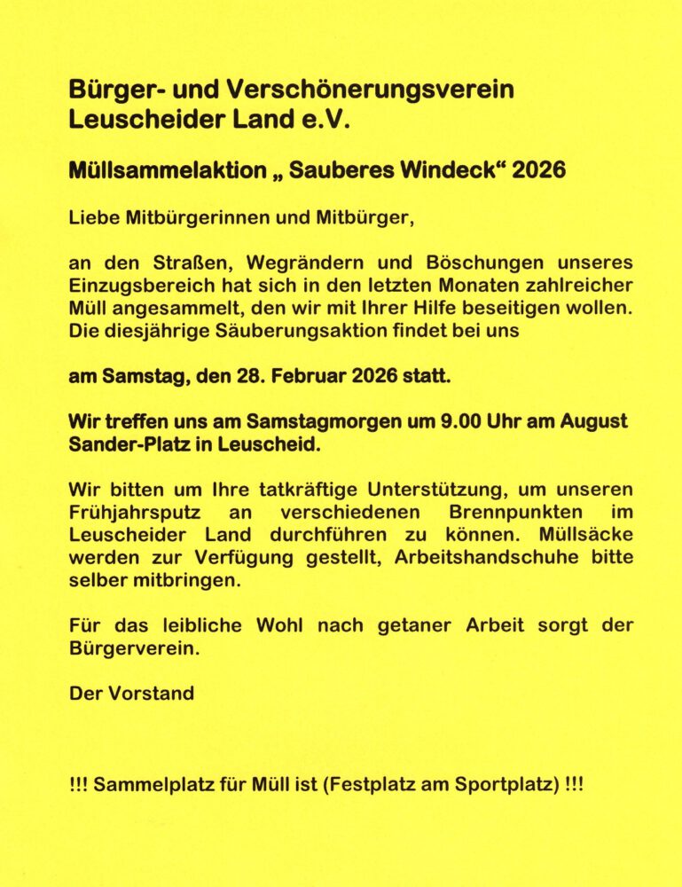 Die diesjährige Säuberungsaktion findet bei uns am Samstag, den 28. Februar 2026 statt. Wir treffen uns am Samstagmorgen um 9.00 Uhr am August Sander-Platz in Leuscheid.
