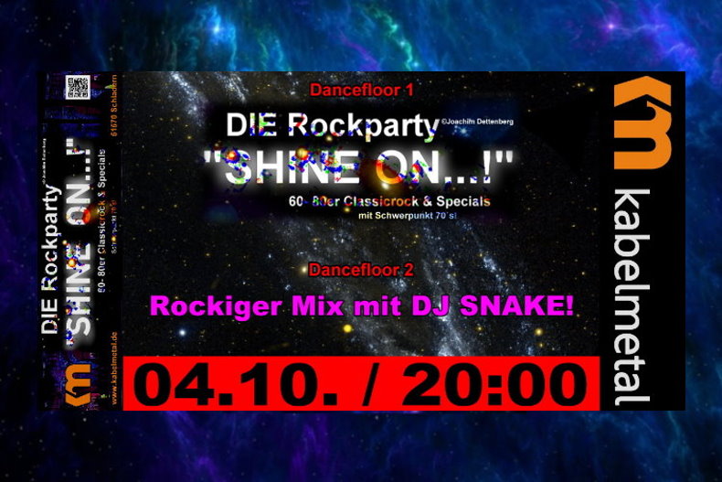 Am Samstag geht es mit der Classicrock-Party „SHINE ON…!“ mittlerweile schon in das 13.Jahr in der „Homelocation“!!! Die DJs und das Team von Kabelmetal freuen sich auf viele treue Fans und Gäste, die bestimmt aus einem Umkreis von 150km und mehr anreisen, um zum x-ten Mal dabei zu sein!