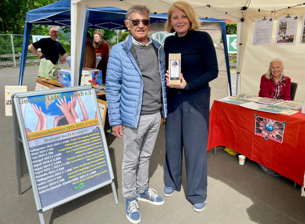 Für die ehrenamtlichen Mitarbeiterinnen und Mitarbeiter des Eine-Welt-Ladens Rosbach e.V. war es eine schöne Gelegenheit sich außerhalb des Ladens zu präsentieren und darauf aufmerksam zu machen, dass es mit der ehrenamtlichen Arbeit des Ladens in den Jahren 2016-2025 möglich war die Summe von 16.500,- € zu spenden. Die Spenden gingen an verschiedene Projekte, über die wir auch berichtet haben. Unser Dank gilt dabei auch immer unserer Kundschaft, die mit ihrem Einkauf den Fairen Handel unterstützt.