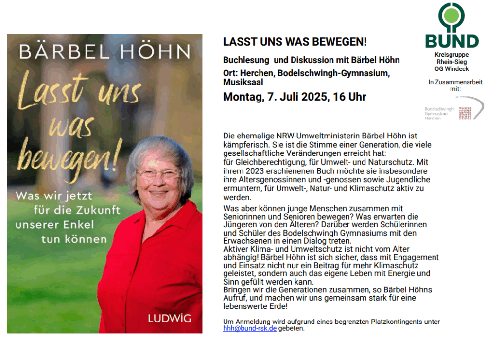 Die ehemalige NRW-Umweltministerin Bärbel Höhn ist kämpferisch. Sie ist die Stimme einer Generation, die viele gesellschaftliche Veränderungen erreicht hat: für Gleichberechtigung, für Umwelt- und Naturschutz. Mit ihrem 2023 erschienenen Buch möchte sie insbesondere ihre Altersgenossinnen und -genossen sowie Jugendliche ermuntern, für Umwelt-, Natur- und Klimaschutz aktiv zu werden.