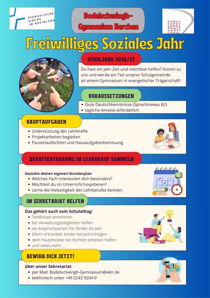 Für das nächste Schuljahr 2026/27 ist die Stelle für ein Freiwilliges Soziales Jahr am Bodelschwingh-Gymnasium Herchen neu zu besetzen. Wenn Du Interesse hast, dann melde dich per eMail im Sekretariat.