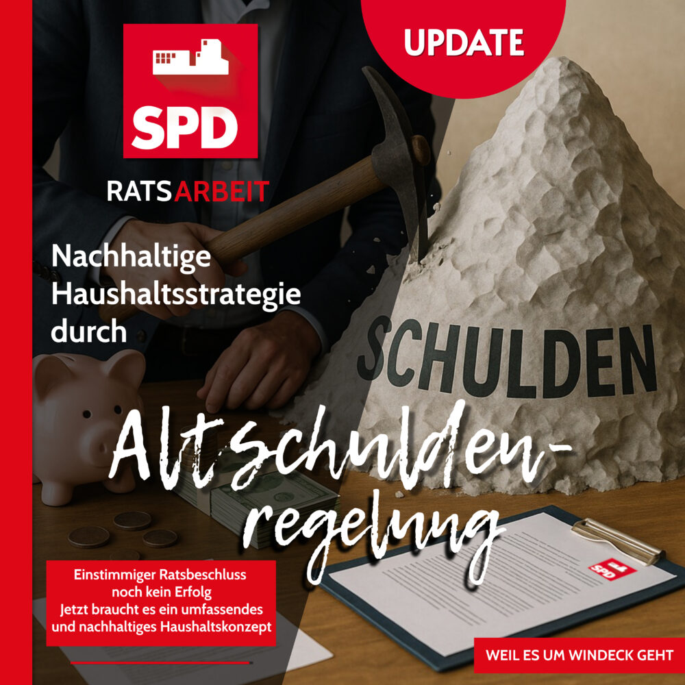 In der Ratssitzung vom 20. Mai 2025 wurde die Beschlussvorlage zur Teilnahme an der Altschuldenregelung des Landes NRW einstimmig angenommen. Die SPD Windeck begrüßt und unterstützt diesen Schritt ausdrücklich. In Zeiten angespannter kommunaler Haushalte ist jede Entlastung willkommen, die den finanziellen Spielraum der Gemeinde erweitert.