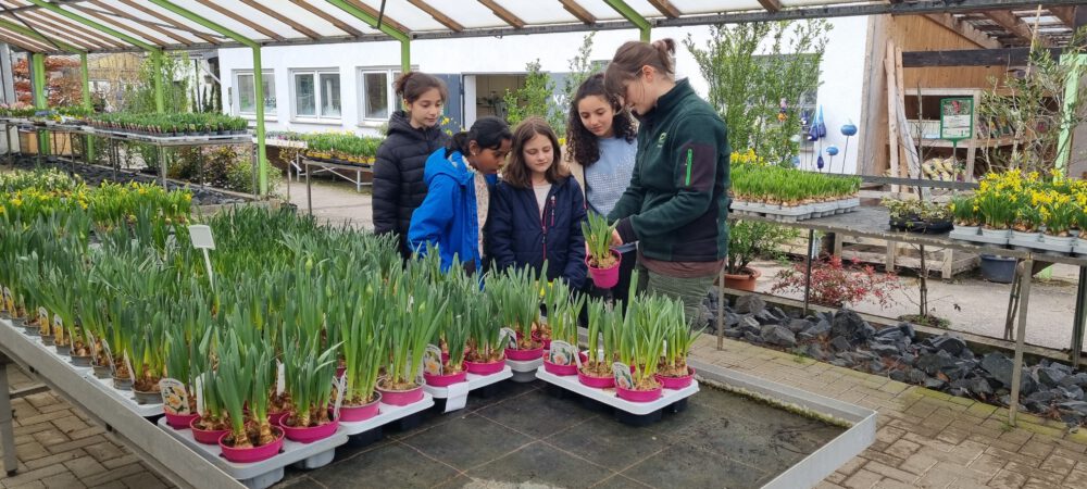 Mit diesem Geld besuchte eine kleine Gruppe der Klasse die Baumschule Ückerseifer in Rosbach. Vier Schülerinnen durften dort Frühblüher für den Schulhof aussuchen. Dabei stellten sie begeistert fest, dass sie viele Pflanzen bereits aus dem Unterricht kannten.