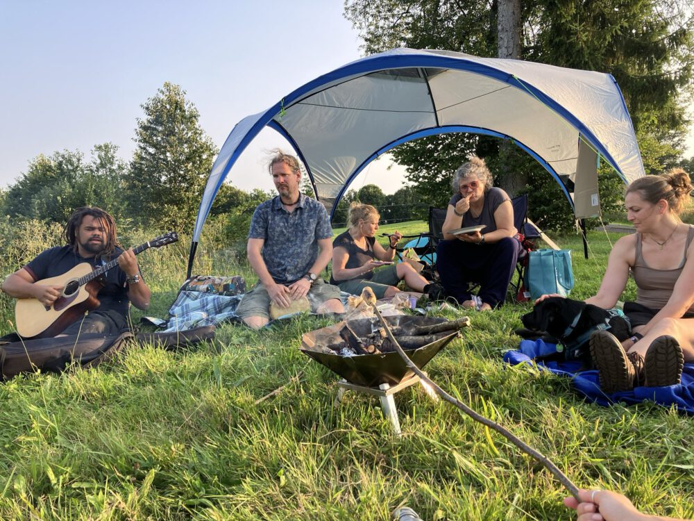 Trotz der Sommerferien kamen am Wochenende junge und ältere Wald- und Naturinteressierte aus dem Windecker Umland und sogar aus Bonn, um sich über das Waldumbauprojekt zu informieren und um an den verschiedenen Aktionen teilzunehmen. Es gab Bogenschießen, Feuermachen mit dem Drillbogen, eine Chillecke mit Hängematten zum Waldbaden, eine Waldführung, sowie Stockbrot an der Feuerschale und Live Musik bei rotem Vollmondaufgang auf der Wilhelmshöhe.