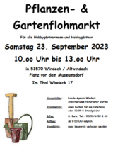Pflanzen- & Gartenflohmarkt Für alle Hobbygärtnerinnen und Hobbygärtner Samstag 23. September 2023 10.oo Uhr bis 13.oo Uhr in 51570 Windeck / AltwindeckPlatz vor dem Museumsdorf, Im Thal Windeck 17 Veranstalter: Lokale Agenda Windeck Arbeitsgruppe Naturnaher GartenStandgebühr: einen Kuchen für die…