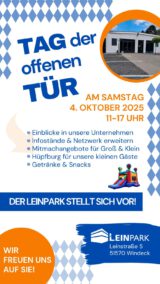 Am Samstag, den 4. Oktober 2025, lädt der Leinpark in Windeck herzlich zum Tag der offenen Tür ein. Von 11 bis 17 Uhr haben Besucherinnen und Besucher die Möglichkeit, die im Leinpark ansässigen Unternehmen kennenzulernen und einen Blick hinter die…