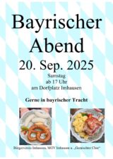 Am Samstag, den 20. September 2025, heißt es wieder: O’zapft is! Ab 17 Uhr laden wir euch herzlich auf den Dorfplatz in Imhausen ein. Freut euch auf:🥨 Weißwürste, Brezn & Haxn🍺 Frisches Bier und andere Getränke🎶🎤 Zünftige Musik & beste…