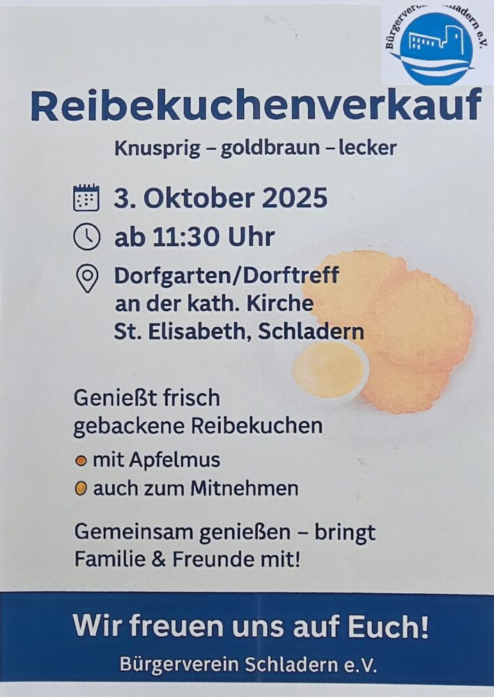 Am 3. Oktober lädt der Bürgerverein Schladern zum Reibekuchenessen in den Dorftreff ein. Ab 11:30 Uhr werden am Dorftreff an der katholischen Kirche die beliebten Kartoffelspezialitäten frisch gebacken. Sollte es regnen, sorgen Zelte für gemütliche Atmosphäre.