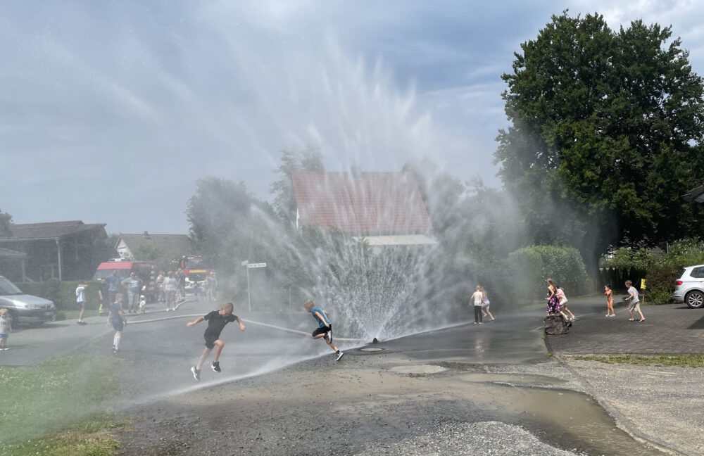 Am Samstag gab es für die Kinder ein Bastelangebot, bei dem u.a. etliche Insektenhotels und Traumfänger entstanden, bevor die Feuerwehr mit 3 Fahrzeugen, darunter ein 10000l-Tankwagen, auffuhr und für den unbestrittenen Höhepunkt des Tages sorgte (s. Foto). Wegen der großen Hitze musste die angekündigte Schnitzeljagd zunächst ausfallen, was bei vielen der mindestens 25 Kinder für traurige Gesichter sorgte. Deshalb wird sie bald nachgeholt.