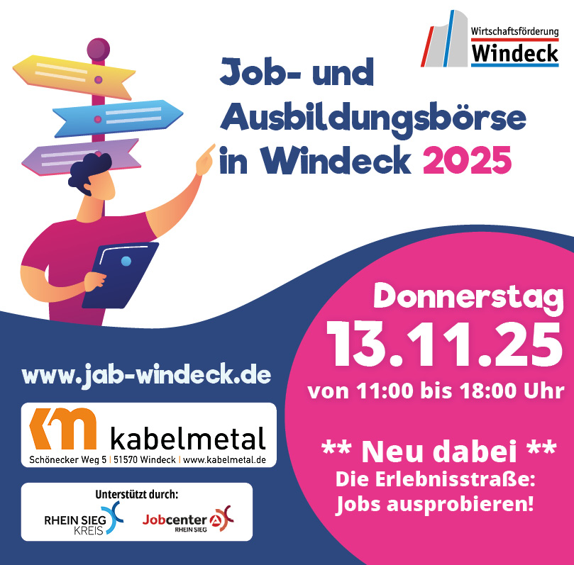 Am Mittwoch, den 14.04.2021 findet zum ersten Mal eine digitale Job- und Ausbildungsbörse (JAB digital) in Windeck statt. Job- und…
