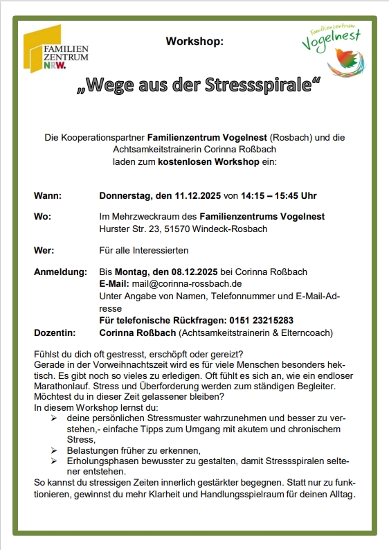 Die Kooperationspartner Familienzentrum Vogelnest und die Achtsamkeitstrainerin Corinna Roßbach laden zur kostenlosen Themenveranstaltung „Wege aus der Stressspirale“ ein. Dieser findet am Donnerstag, dem 11. Dezember 2025 von 14:14 – 15:45 Uhr im Mehrzweckraum des Familienzentrums Vogelnest in der Hurster Str. 23 in 51570 Windeck-Rosbach statt.