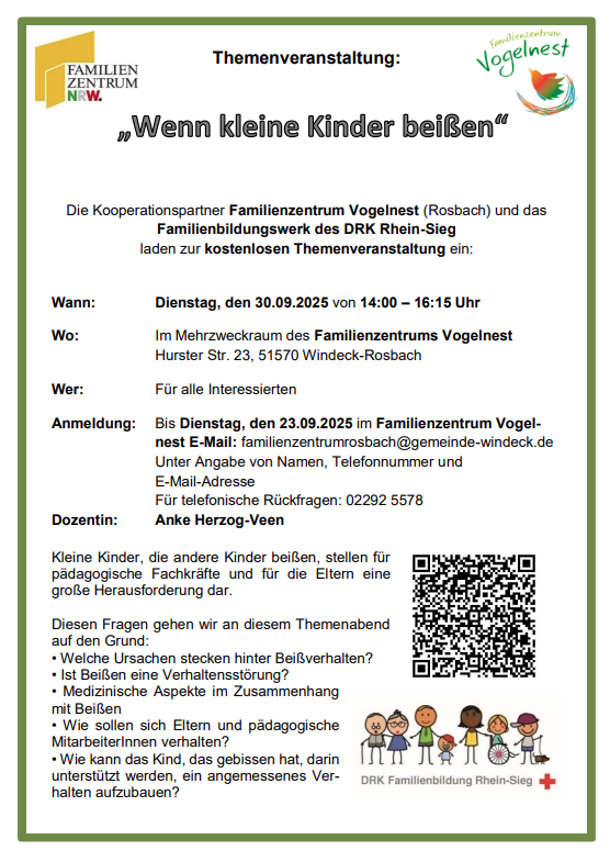 Die Kooperationspartner Familienzentrum Vogelnest (Rosbach) und das Familienbildungswerk des DRK Rhein-Sieg laden zur kostenlosen Themenveranstaltung ein:
