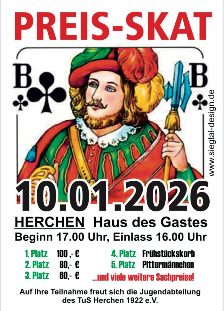 Ein Skatspiel lebt von der Atmosphäre, vor allem von den Sprüchen. So auch beim traditionellen Preisskat der Jugendabteilung des TuS Herchen am Samstag, den 10.01.2026 im „Haus des Gastes“ in Herchen.