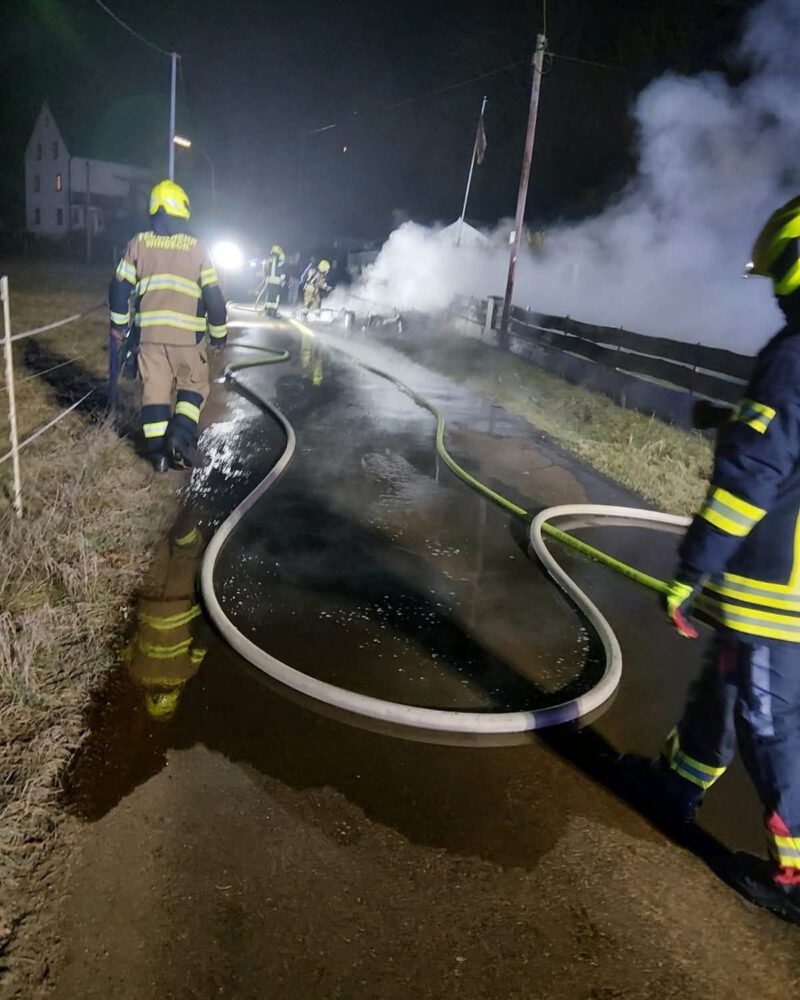 In der Nacht zu Mittwoch (31.12.2025) kam es im Hüttenweg in Imhausen zu einem Brandeinsatz, der nur knapp an einer Katastrophe vorbeischallte. Die Anwohner eines dortigen Wohnhauses wurden durch ein lautes Knallgeräusch aus dem Schlaf gerissen. Beim Blick aus dem Fenster bot sich ihnen ein dramatisches Bild: Ein am Fahrbahnrand geparkter Wohnanhänger stand lichterloh in Flammen.