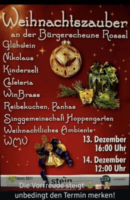 In diesem Jahr möchten wir wieder am dritten Advent, den 13.12. ab 16 Uhr und am 14.12. ab 12 Uhr an unserer Bürgerscheune einen großen Weihnachtszauber veranstalten.  Euch erwarten viele schöne Überraschungen: Frische Reibekuchen, Panhas, Kochs Backnaschwerk, Weihnachtsschmuck, Kinderkarussell, Metallkunst, Räucherfisch, selbst gebackene Kekse, Cafeteria,…