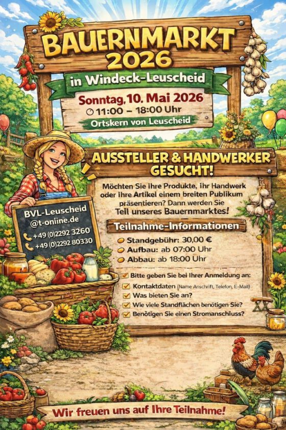 Am Sonntag, den 10. Mai 2026 ab 11.00 Uhr veranstalten wir wieder einen Bauernmarkt in der Ortsmitte von Leuscheid entlang der Saaler Straße mit Unterstützung der örtlichen Vereine und Dorfgemeinschaften. Einige Akteure präsentieren Ihr altes handwerkliches Können, Fertigkeiten und Techniken.…